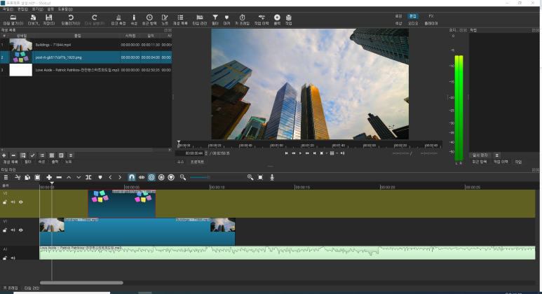 마지막으로 각각의 트랙에 위에서 부터 재생목록있는 이미지, 영상, 오디오를 넣어 줍시다.