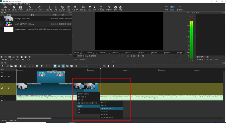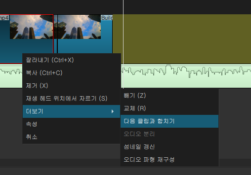 이럴 때 해결방법은 앞 부분의 영상을 선택한 다음에 '마우스 오른쪽 버튼을 클릭, 더보기, 다음 클립과 합치기'를 사용하면 됩니다.