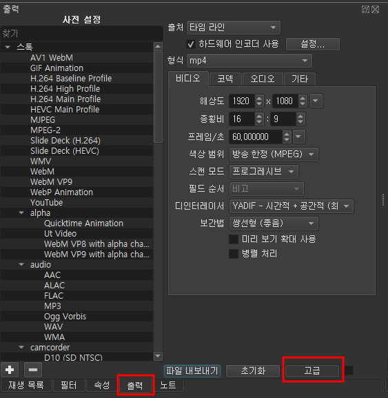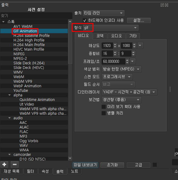 사전설정에 GIF Animation을 선택해보면 출력(고급) 탭에 형식이 자동으로 gif로 변경되는 것을 확인 할 수 있습니다.