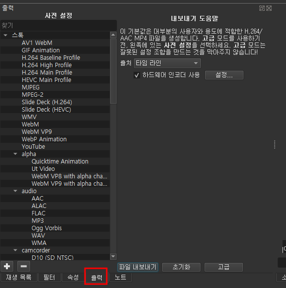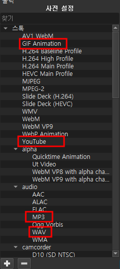 출력 탭의 왼쪽 부분 사전설정을 보면 무언가 많은 선택지가 있는 것을 확인할 수 있습니다.