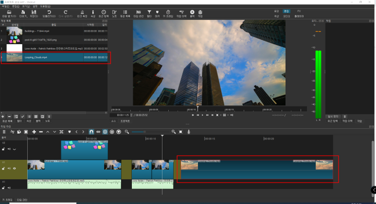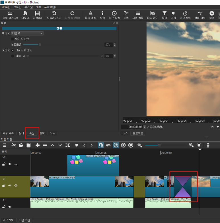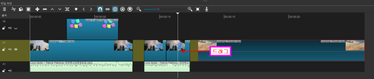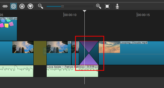 타임라인에 있는 것 처럼 저 영상 사이에 자연스러운 장면 전환이 필요하다면, 뒤에 있는 영상을 그냥 드래그 해서 겹쳐주세요.