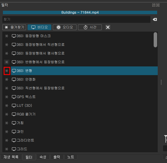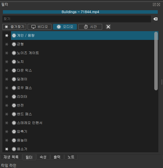 Tip. 비디오에 오디오 필터는 넣어도 되지만, 오디오에 비디오 필터를 넣으시면 아무런 의미가 없습니다.