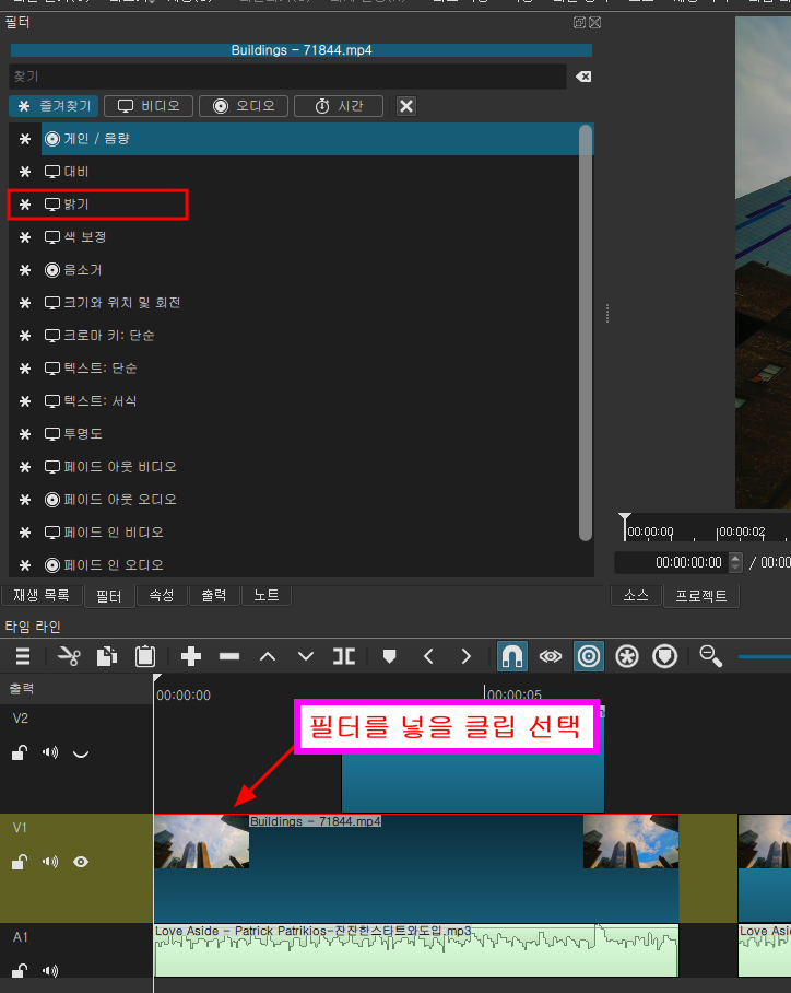 비디오 트랙에서 클립을 하나 선택해주시고 필터 탭, + 버튼을 클릭하여 필터 종류 중에 밝기 필터를 선택해 주세요.